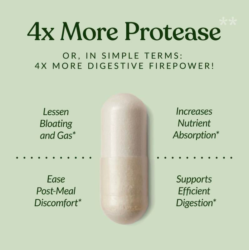 Each bottle includes a full-spectrum digestive enzyme formula with 18 targeted enzymes, designed to support digestion of protein, carbs, fats, and fiber.